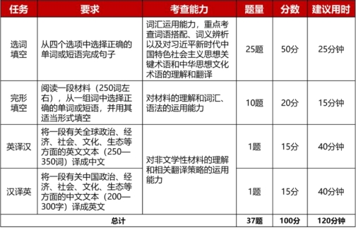 (1)口译赛题涵盖习近平新时代中国特色社会主义思想核心内容,涉及经济建设、政治建设、文化建设、社会建设和生态文明建设等领域的重要话题,考查形式包括视译、交替传译(主旨口译、会议口译、对话口译)等,成绩由专家打分取平均成绩,材料融入习近平新时代中国特色社会主义思想关键术语和中华思想文化术语。